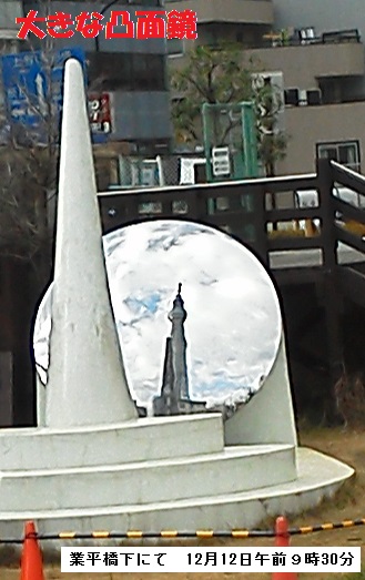 業平橋から南に大横川が流れていて、この周辺は大横川親水公園となっています。その起点の業平橋したには大きな凸面鏡が設えてあって、スカイツリー全体が映し出されています。
