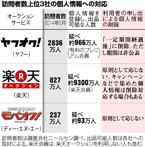 「登録情報については削除しておりません」/大阪府の30代の女性は7月下旬、オークションサイト「モバオク!」からの返信メールに驚いた。/2年前から化粧品などを出品し、多くて月4、5点売れた。だが7月、長女(7)と次女(4)の個人情報が漏れたとベネッセホールディングスから手紙が届き、不安になった。モバオクにも住所やクレジットカード情報を登録していたからだ。すぐに個人情報の削除を求めたが断られた。/モバオク運営会社の親会社ディー・エヌ・エーは取材に「(個人情報の保存は)トラブルが起きた時に対応するため」と回答。偽物の売り抜けを防いだり、トラブルを起こした利用者の再入会を把握したりするためだという。ただ、モバオクは、個人情報の利用目的についての規約に、個人情報を削除できないことは記していない。/調査会社「ニールセン」によると、モバオクはネットオークション訪問者数で国内業界3位。上位2社も原則として、利用者の申し出による個人情報の削除には応じていない。/1位の「ヤフオク!」を運営するヤフーによると、個人情報については規約で「(削除を要求すると)一定期間経過後に削除される」とするが、期間は非公開。取材に「犯罪などに使われた時に対応できるよう十分な期間をもうける」と長期の保存を示唆した。/2位の楽天オークションは無料の楽天会員(延べ約9300万人)も出品できるが、個人情報について楽天は「削除対応できないことがある」と個人情報保護方針に記す。取材に「会員情報は警察からの照会など法律に基づく対応等のために保管している」と答えた。
