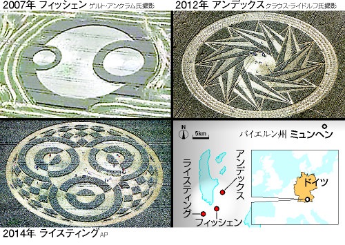 ■直径75メートル、麦畑に一晩で:ドイツ南部ミュンヘンから西へ車で約1時間のライスティング村。黄金色の穂が垂れる麦畑の一角に、数百人もの人だかりができていた。人々の視線の先にあるのは、直径約75メートルの巨大な幾何学模様だ。/発見されたのは7月18日。熱気球で上空を飛んだ人が偶然、見つけた。コンパスで描いたような大型の円の中に、三つの円を重ねた複雑な模様が浮かび上がる。地元の人々の話を総合すると、同17日夕に近くの農家が通りかかった時は「何もなかった」。17日夜から18日未明の間に「出現」したとみられる。/この畑で農業を営むクリストフ・フットナーさん(43)は困惑するばかりだ。倒れた麦の損害は2千ユーロ(約27万円)ほど。見物人が多くて収穫もままならない。「それにしても、よくできている。短時間でどうやって……」/記者も半信半疑で現場を訪ねた。腰の高さほどの穂の茎が地上から数センチで同じ方向に倒されている。まるでゴザを敷いたようだ。円の中心に立って、ますます驚いた。穂が一糸乱れず渦を巻き、編み上げられたようになっている。素人目には「未知なる力が介在している」と思っても不思議ではない。大型機器を運び込んだ形跡もない。/周りを見渡すと、巨大なパラボラアンテナが立ち並ぶ。アフリカ大陸などに衛星中継するために造られ、1969年にはアポロ11号が人類初の月面着陸に成功した映像を中継したという。麦畑と巨大アンテナ。そんな光景も「宇宙の神秘」を連想させる。