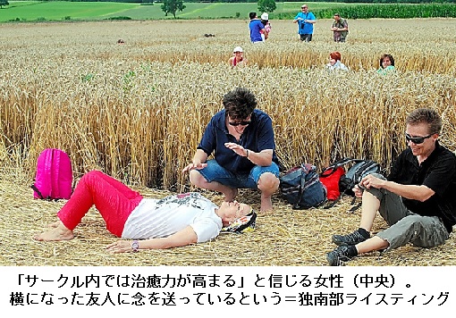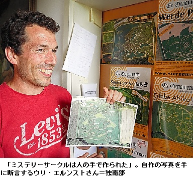 ■「信奉者」殺到、地元は冷静:現場は「サークル詣で」の人々が引きも切らない。多いときは数千人に及ぶ。/「パワーをじかに感じたい」と、サークル内では多くの人が裸足になる。仲間と抱き合い瞑想(めいそう)する人、歌い踊る人、計測機器を手に歩き回る人……。/オーストリアから家族と来た芸術家のリディア・バスナーハウザーさん(37)は「円の中心に地球のエネルギーを感じる」と興奮。/独西部シュツットガルトの会社員ユアヒム・シーボンさん(51)は、車いすで訪れた。「現場の3キロほど手前から高いエネルギーを感じた。不自由な足の治療にも効果があるはずだ」/人口約2千人の村は一変した。数軒しかないホテルは連日、満室状態で、レストランも大盛況。だが、住民の多くはさめている。カフェで井戸端会議をしていたお年寄りたちは「学生か変人のいたずらに違いない」。雑貨店の男性主人も「よそ者が入り込んで騒々しい。早く刈り取ってしまえばいいのに」と憤る。/実は、この辺りでサークル騒ぎは3回目。最初は2007年、約5キロ北東のフィッシェンに出現。12年には約10キロ北東のアンデックスで見つかった。住民たちの驚きは大きくない。/サークルを描いたTシャツなどを売る案も出たが、反対が多く断念。募金箱を設け、空撮写真を売ってはいるが、倒れた麦穂の損害に充てるためだ。ハッケ村長(43)は笑顔で語る。「いたずらを金もうけに結びつけたら、興ざめでしょう?」