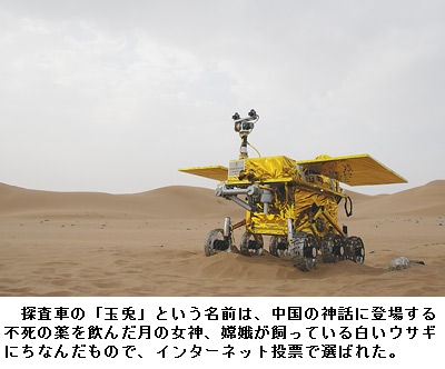 中国の月面車、中秋のスーパームーンに目覚める・・・関係者とファンに大きなボーナス ―― 中国が2013年12月に打ち上げた嫦娥3号で月面の「雨の海北端」に送り込んだローバー(月面車)の「玉兎」が7日、起動に成功した。おりしも8日は旧暦8月15日の中秋節、翌9日は軌道上で月が軌道に最接近した際に満月の状態を迎えるスーパームーンだ。玉兎はトラブルを起こしながらも、設計寿命の3カ月をはるかに超える、運用開始後約9カ月後の現在も活動を続けている。/「玉兎」は太陽電池を電力源にしているため、太陽光がない時期は活動を休止せざるをえない。月の1日は地球の約1カ月に相当。したがって「玉兎」はおおむね1カ月を周期に「寝たり起きたり」を繰り返すことになる。/2014年1月には制御に異常が生じたと発表された。その後、移動が出来なくなったことが確認された。しかし、通信は可能で、「月の昼」になると再起動することを繰り返している。7日には9回目の再起動に成功した。/「玉兎」の設計寿命は3カ月だったが、運用開始から9カ月後の現在も活動を続けている。関係者やファンにとっては、「うれしいボーナス」が続いていることになる。