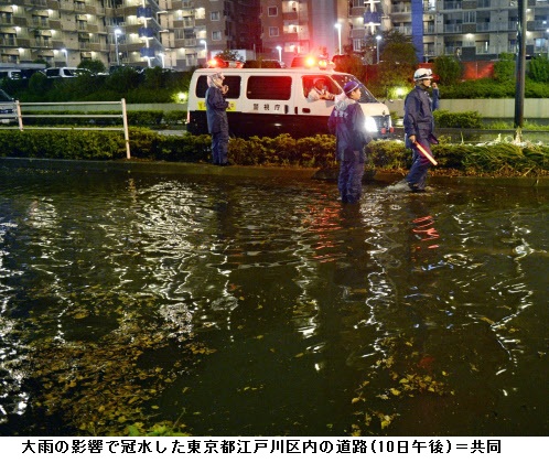 北・東日本中心に大雨 11日も大気不安定続く ―― 北日本の西の海上にある低気圧などの影響で、10日午後は北・東日本を中心に大気の状態が不安定になり、各地で大雨が降った。レーダーの解析では北海道登別市や東京都台東区、大阪府池田市付近などで1時間に100ミリ以上の猛烈な雨が降ったとみられる。/東京の都心部でも午後5時16分までの1時間に71.5ミリの雨量を観測した。北海道と静岡県の一部では土砂災害警戒情報が出された。/気象庁によると、11日も北・東日本を中心とした広い範囲で雷を伴う大雨が降る恐れがある。11日午後6時までの24時間予想雨量は多いところで北海道200ミリ、東北、関東甲信、東海100ミリ。気象庁は低い土地の浸水や土砂災害に注意するよう呼びかけている。/東京都内では10日夕、23区と19市に一時、大雨・洪水警報が出た。東京消防庁によると、午後6時半ごろ、江戸川区小松川で道路が冠水し、車9台が立ち往生した。けが人などはなかった。同区によると、夜までに、住宅が床上浸水したとの連絡が22件あった。 (日本経済新聞 2014/9/11 1:31)