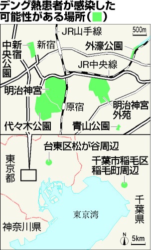 代々木公園以外、新たに3人感染 デング熱 ―― 東京・代々木公園周辺以外で新たに3人がデング熱に感染していたと、厚生労働省が10日発表した。いずれも東京都内で、1人は台東区松が谷の勤務先周辺で、もう1人は外濠(そとぼり)公園(千代田区)か青山公園(港区)で感染したとみられる。新宿中央公園でも2人目となる患者1人が確認された。都は10日午後、青山公園南地区で蚊の駆除をした。/代々木公園とその周辺でも新たな感染者が確認され、デング熱の国内感染は15都道府県在住の計96人になった。重症者はいないという。96人のうち、代々木公園周辺以外は6人。/台東区内で感染したとされるのは千葉県松戸市に住む50代の会社員男性で、勤務先は住宅街にある。台東保健所によると、男性は発症前の8月28日までほぼ毎日、自宅と職場を往復し、「職場の近くで毎日のように蚊に刺されていた」と説明しているという。/ 外濠公園か青山公園で感染したとみられるのは神奈川県大和市の20代男性。/また、千葉市稲毛区の無料低額宿泊所周辺で感染したとみられる60代男性について、厚労省は、ウイルスの遺伝子配列が代々木公園で感染した人たちのウイルスと一致したと発表した。代々木公園かその周辺で感染した人が千葉でも蚊に刺され、ウイルスを持った蚊にこの男性が刺された可能性が高いとみている。/一方、目黒、新宿両区は10日、戸山公園(新宿区)と菅刈公園、西郷山公園(いずれも目黒区)の蚊からウイルスは検出されなかったと発表した。 (朝日新聞 2014年9月11日05時00分)