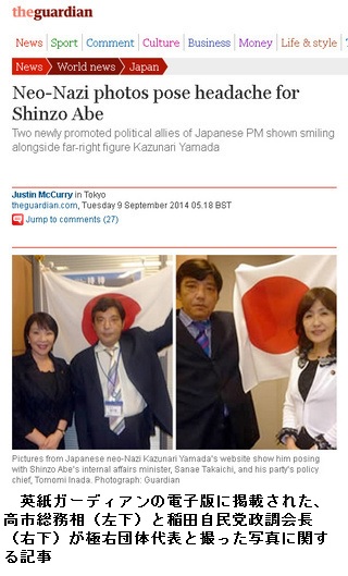 高市氏が極右代表と写真 稲田氏も「素性知らずに」―― 第2次安倍改造内閣で総務相に就任した高市早苗衆院議員や、自民党の稲田朋美政調会長ら国会議員3人が、極右団体代表の男性と議員会館で会い、ツーショットで撮った写真が団体のホームページに一時公開されていたことが9日、分かった。議員側は「男性の人物像は知らなかった」と説明した。/団体は「国家社会主義日本労働者党」で、ホームページにはナチス・ドイツの象徴「かぎ十字」やこれに似たマークを数多く掲載。英紙ガーディアン(電子版)など海外主要メディアも報道しており、国際的に波紋が広がる可能性がある。当該のページは既に削除されている。/高市氏の事務所によると、男性と会ったのは3年以上前で、極右団体の代表とは知らなかった。雑誌のインタビュアーの補佐として議員会館を訪れ、インタビュー後に「一緒に写真を撮りたい」と言われたとしている。/稲田衆院議員の事務所は「雑誌取材の同行者として会い、その際、撮影に応じたとみられる。素性や思想は把握しておらず、それ以後何の関係もない」と釈明した。/ガーディアンは「ネオナチとの写真、安倍晋三首相の頭痛の種に」と題する記事で、内閣改造の目玉人事である女性閣僚の高市氏や、稲田氏が団体代表と一緒に写真に納まったことを批判的に伝えた。/自民党の西田昌司参院議員との写真も掲載。事務所は「2011年8月31日に取材を受けた。『ライターの山田』と名乗っていた。ネオナチの話は一言もしていなかった」と説明し、「彼の思想に賛同して会ったわけではない」と弁解した。/共同通信は団体に取材を申し込んだが、9日夜時点で回答はなかった。/団体のホームページには「東亜新秩序建設」「わが人種の優秀性を主張する」「攘夷すなわち民族浄化を推進しなければならない」との表現もあった。(共同通信) (47NEWS 2014/09/10 14:52)