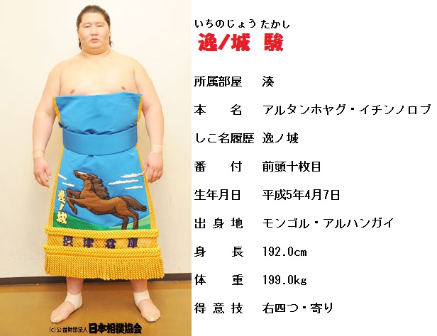 角界にとてつもなく大型の新入幕力士が現れました。昨日の11日目まで10勝1敗と2桁白星、役力士経験者をばたばたとなぎ倒しての2桁勝利です。逸ノ城 駿(いちのじょう たかし、1993年4月7日生まれ )は、モンゴル国アルハンガイ県バットツェンゲル郡出身(遊牧民)で、湊部屋所属の現役大相撲力士。本名はアルタンホヤグ・イチンノロブというのだそうです。身長192cm、体重199kg。最高位は現在の東前頭10枚目(2014年9月場所)です。この先どこまで勝ち星を伸ばすか目が離せず、楽しみです。