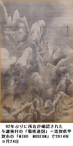 与謝蕪村:水墨画「蜀桟道図」 92年ぶりに見つかる ―― 江戸時代中期の俳人で画家の与謝蕪村(1716〜83年)が描いた水墨画「蜀桟道図(しょくさんどうず)」が92年ぶりに見つかった。鑑定した美術館「MIHO MUSEUM」(滋賀県甲賀市)が24日、発表した。1922年に発刊された「蕪村画集」にモノクロ写真が掲載されて以降、所在が分からなくなり、「幻の名作」と言われていた。/作品は長さ167.5センチ、幅98.9センチ。中国四川省北部に通じる険しい山や渓谷に造られた「蜀桟道」を旅人が行き交う様子が墨や岩絵の具で絹地に描かれ、蕪村が晩年に用いた雅号「謝寅(しゃいん)」という署名もある。/最近になってシンガポールの会社が所蔵しているという情報が寄せられ、今年5月に同美術館の岡田秀之学芸員が鑑定。山や樹木の精密な描き方や人物のユーモラスな表情などから蕪村の作品と確認した。安永7(1778)年、依頼人に蜀桟道図を送ったとする蕪村の手紙の写しが残っており、この年に完成させたとみられる。/藤田真一・関西大教授(国文学)は「冬の中国の自然の描き方や、旅人の表情に蕪村の作品の特徴がよく出ている。晩年の代表作で、蕪村についての研究が一層進むだろう」と話している。/来年3月18日から東京都港区のサントリー美術館で、7月4日からMIHO MUSEUMで開かれる特別展「生誕三百年 同い年の天才絵師 若冲と蕪村」で展示される。 毎日新聞 2014年09月24日 19時03分(最終更新 09月24日 20時00分)