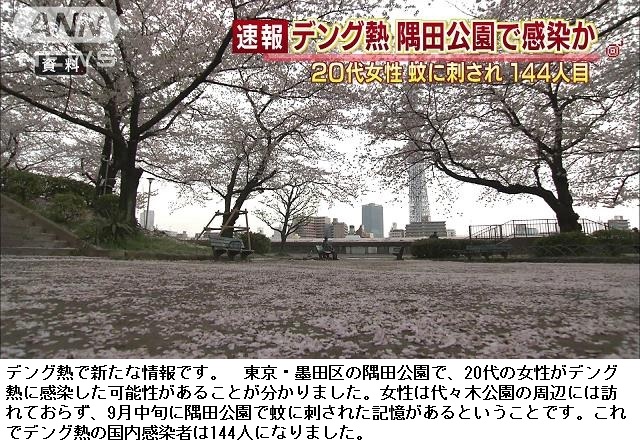 テレビで台東区の天気情報を見ていますと、左隅ある台東区ニュースに「台東区で蚊に刺されデング熱」と出ていました。爺も毎朝隅田公園を歩き回り、蚊に指されたことは何度もあるので、注意しなければと思いました。
