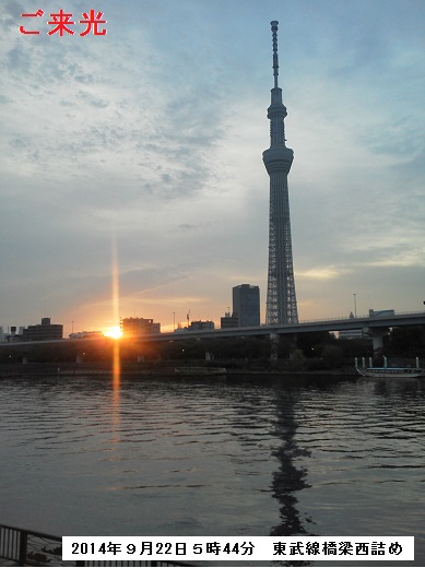 9月27日 11時50分送信 その後脚の様子は如何? 彼岸も過ぎてスッカリ秋らしくなりましたが、その後脚の様子は如何ですか? /彼岸か過ぎて日の出の位置がかなり南よりになり、スカイツリーに近づいてきました。添付の写真は彼岸の前日に撮ったものです。/隅田公園にもデング熱ウイルスを持った蚊が出没するようになったらしいですね。まあ、蚊に刺されないよう気をつけて徘徊することにしましょう。 セッチンより