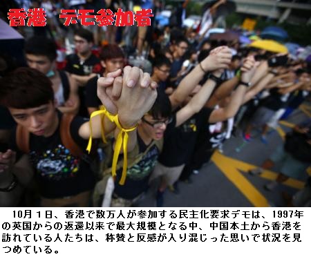 アングル:香港デモに中国から称賛と反感、「第2の天安門」警戒も ―― [香港 1日 ロイター]- 香港で数万人が参加する民主化要求デモは、1997年の英国からの返還以来で最大規模となる中、中国本土から香港を訪れている人たちは、称賛と反感が入り混じった思いで状況を見つめている。/北京から観光目的でやってきたという29歳の女性は「人生で初めて政治を身近に感じた」とし、「これは香港にとって歴史的瞬間だ」と語った。中国は1日からの国慶節(建国記念日)の連休に入り、香港にも本土から多くの旅行者が訪れている。/この女性は、デモの様子を映した写真を友人たちとシェアし、インターネットにも投稿する予定だという。「最初はかなり怖かったが、今はデモを強く支持している。いつの日か、中国(本土)でもこうしたことが起きると信じている」と語った。/ただ、それはまさに中国政府が避けたいことでもある。共産党指導部は、民主化要求の声が本土にも広がることを警戒しており、香港のデモに関するニュースやソーシャルメディアでのコメントを厳しく検閲している。/今回のデモは1997年の香港返還以来で最大規模となっただけでなく、中国政府にとっては、1989年の天安門事件以来で最大の政治的難局となっている。/四川省の成都から来たという20代半ばの女性は、天安門事件は幼かったため記憶にないと話す。また中国では「愛国主義教育」により、若者の多くが天安門事件などの反政府デモについて限られた知識しか持っていない。/女性は「こういった運動を目にするのは初めて。現場は非常に整然と統制が守られている。思っていたような混乱状態とは違う」と印象を口にした。<「第2の天安門」を警戒> 今回のデモは中国政府に対し、2017年の香港次期長官選挙で完全な民主的選挙を実施するよう求めており、梁振英・現行政長官の辞任も要求している。/中国政府は香港には「一国二制度」の原則を適用し、本土では見ることのできない自治と自由を与えているが、今回のデモは違法行為だと非難。本土から訪れている人たちの中にも、法律を破るのは正しいやり方ではないという意見はある。/香港科技大学の博士課程で学ぶ男性は「彼らの要求は支持するが、目標を達成するための過度に強引な行動は支持しない。法を犯すのは良くないことだからだ」と述べた。/また、中国政府から受けた恩を忘れた香港の住民に幻滅したとの声も聞かれる。/広東省の深センから買い物目的で1日に香港入りしたという女性は、デモ隊が民主的選挙を求めるのは「本土に対して礼を欠く行為」だと非難。「中国政府は香港に大きな発展をもたらしたにもかかわらず、彼らはそれを認めていない」と憤りを見せた。/中国国民の多くは、天安門事件での政府の厳しい弾圧姿勢に衝撃を受け、何十年に及ぶ共産党政権下での不安にも疲れ、革命的大衆運動という考えにはためらいを感じている。/本土育ちで現在は香港で慈善団体を運営している女性は、今回のデモが暴徒化した場合、中国政府が強硬な手段に訴える可能性があると警戒する。/「共産党にはそれを実行する力がある。これまでも見てきたし、また繰り返されるだろう。もっと根の深い問題があり、それを正すには何世代もかかる。1つのデモでは解決しない」と語った。 (ロイター 2014年 10月 1日 12:45 JST)