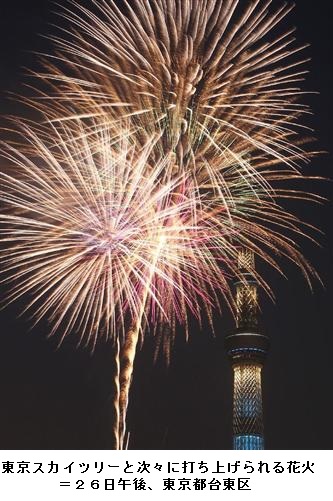 隅田川花火大会 2万発が夏の夜空に ―― 東京・下町の夏の風物詩「隅田川花火大会」が26日夜開かれ、合わせて2万発の花火が夏の夜空を彩りました。/「隅田川花火大会」は、江戸時代から歴史が続く全国でも最大規模の花火大会として知られ、37回目を迎えることしは、26日の夜7時すぎから始まりました。/会場には90万人を超える見物客が集まり、隅田川に浮かべられた4隻の船の上から色とりどりの花火が打ち上げられるたびに、大きな歓声が上がっていました。/ことしは、毎年恒例となっている全国の10の花火業者によるコンクールのほか、6年後に東京オリンピック・パラリンピックが開催されることを記念して五輪をイメージした花火などが打ち上げられました。/26日の夜は合わせて2万発の花火が夏の夜空を彩り、家族連れや浴衣姿の若者たちが楽しんでいました。/神奈川県から家族と訪れた50代の男性は、「花火を見るために長い時間並んで疲れましたが、迫力があり感動しました」と話していました。 (NHK WEB 7月26日 21時00分)