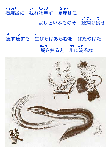 意味: 石麻呂(いはまろ)さんに申し上げますよ。夏痩(や)せに良いそうですから鰻(うなぎ)を捕って食べてくださいな。