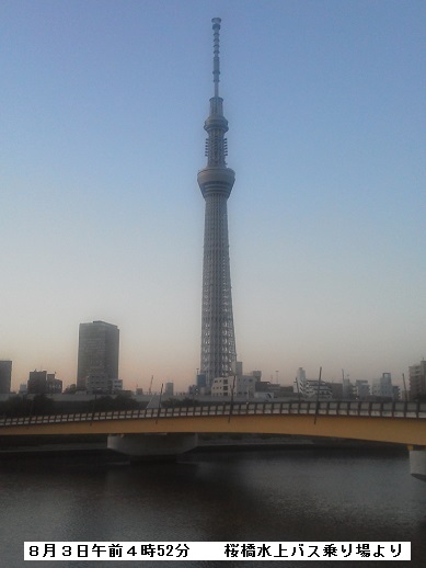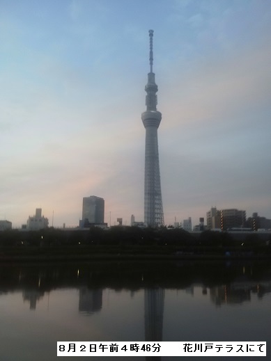 8月2日10時3分発信 暑中見舞い 暑中お見舞い申し上げます。/平素ご無沙汰していますが、如何お過ごしでしょうか。私は、毎朝お決まりのように6kmほど隅田川周辺をあるいて、あとはクーラーを利かせた部屋でゴロゴロしていのす。兎に角この暑さでは、何をする気にもなれません。/皆さん方のご健勝をおいりれしていのす。/添付の写真は今朝ほど撮ったものです。/近況などお知らせくだされば幸甚です。