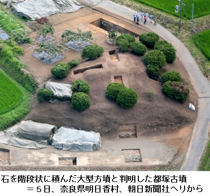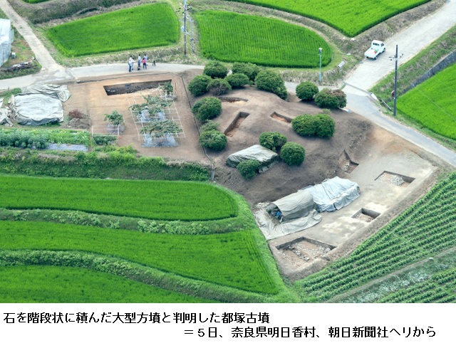 国内で初、奈良に大型ピラミッド方墳 蘇我稲目の墓? ―― 奈良県明日香村の都塚(みやこづか)古墳(6世紀後半ごろ)が、石を階段状に積み上げた、国内では類例のない大型方墳とみられることがわかった。村教委と関西大が13日発表した。ピラミッドのような特異な構造や天皇陵にも迫る規模から、多くの渡来人を配下に置き、天皇の外戚(がいせき)となって台頭した権力者、蘇我稲目(そがのいなめ、?~570)ら、蘇我一族の有力者の墓との見方が出ている。/1967年の関西大の調査で2~3段に土を盛った一般的な方墳(一辺約28メートル)か円墳の可能性が指摘されていたが、今回、墳丘部の発掘で拳大~人頭大の川原石を積み上げた階段状遺構が出土し、東西約41メートル、南北約42メートルの方墳と判明した。/2段目以上は高さ30~60センチ、幅約1メートルの平坦(へいたん)部を計5段以上、階段状に石と土を盛り重ねた構造(高さ4.5メートル以上)とみられる。同様の構造は、中国東北部から朝鮮半島北部を支配した高句麗(こうくり)の古墳との類似性が指摘されている。/稲目は娘を天皇に嫁がせるなどして馬子(うまこ)、蝦夷(えみし)、入鹿(いるか)と続く蘇我氏全盛期の礎を築き、孫同士から聖徳太子(厩戸皇子〈うまやとのみこ〉)が生まれた。都塚の一帯は、一辺約50メートルの方墳とみられ、被葬者として馬子が有力視されている石舞台古墳(特別史跡、7世紀前半)があるなど蘇我氏の本拠地のひとつとされる。白石太一郎・大阪府立近つ飛鳥博物館館長(考古学)は「こんな特殊な構造の方墳は国内で見たことがない。蘇我一族の有力者の墓だろう」と話す。/現地説明会は16日午前10時~午後3時。問い合わせは村教委文化財課(0744・54・2001)。