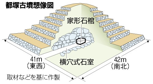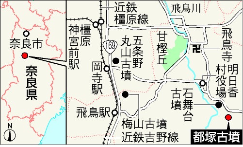 〈都塚古墳〉 7世紀の飛鳥京の中心部から南東に約1キロ離れた尾根の先端部にある。横穴式石室(全長約12メートル)に凝灰岩をくりぬいた家形石棺が納められているが、盗掘されたとみられ、石棺内に人骨は確認されていない。67年の関西大の調査では木棺も安置されていた痕跡が見つかった。副葬品には土師器(はじき)や須恵器、鉄鏃(てつぞく)などの鉄製品があった。 (朝日新聞 2014年8月14日05時51分)