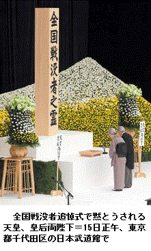 首相「不戦の誓い」今年もなし 69回目終戦記念日 戦没者追悼式 ―― 六十九回目の終戦記念日を迎えた十五日、政府主催の全国戦没者追悼式が日本武道館(東京都千代田区)で開かれ、天皇、皇后両陛下、遺族約四千七百人らが戦争の犠牲者約三百十万人の冥福を祈った。安倍晋三首相は式辞で「世界の恒久平和に、能(あた)うる限り貢献する」と述べたが、昨年と同様、歴代首相が表明していたアジア諸国に対する加害と反省や、「不戦の誓い」の言葉はなかった。/集団的自衛権行使を容認する七月の閣議決定後、初の追悼式。首相は式辞で「戦没者の貴い犠牲の上に、私たちが享受する平和と繁栄がある。そのことを片時たりとも忘れない」と述べた。/「歳月が流れても、変えてはならない道がある。今日は、その平和への誓いを新たにする日だ」と強調したが、戦争の反省を踏まえた「不戦の誓い」や、アジア諸国に多大の損害と苦痛を与えたことへの「深い反省」には触れなかった。/アジア諸国への加害と反省は、一九九四年の式典で当時の村山富市首相が読み上げて以降、第一次安倍内閣での安倍首相を含め、歴代首相が踏襲してきた。「不戦の誓い」も例年読み上げられてきた。安倍首相は昨年の式辞でもこれらに触れず、批判を受けていた。/首相は、七月に南太平洋のパプアニューギニアを訪問したことにも触れ、「いまだ故郷への帰還を果たされていないご遺骨のことも決して忘れない」と遺骨収集に意欲を示した。昨年の式辞と、部分的には同じ表現が盛り込まれていた。/追悼式には衆参両院議長や最高裁長官らも参列。首相の式辞後、正午の時報と同時に、参列者全員が黙とうをささげた。/天皇陛下は「戦争の惨禍が再び繰り返されないことを切に願い、世界の平和とわが国の一層の発展を祈ります」とお言葉を述べられた。/また、遺族代表の牧野笑子(えみこ)さん(88)=愛知県豊橋市=は「過去の悲惨な戦争から学んだ教訓と平和の尊さを次の世代にしっかりと伝え、この悲しい歴史を二度と繰り返さないことを誓います」と追悼の辞を述べた。/遺族の高齢化が進んでおり、参列予定者のうち戦没者の妻は十九人(0.4%)だけで、多くは戦没者の子どもや兄弟姉妹、孫。最年長者は神奈川県の難波いそさん(百歳)、最年少は鹿児島県の福田鈴(りん)さん(7つ)。