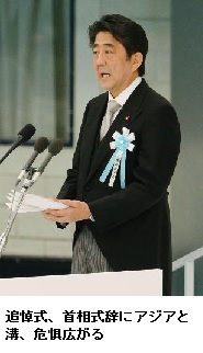 追悼式、首相式辞に危惧広がる ―― 安倍晋三首相が昨年に続き、全国戦没者追悼式の式辞でアジア諸国への加害責任に言及しなかった15日、遺族や識者から「アジアとの溝が深まる」と危惧する声が上がった。7月に集団的自衛権の行使容認を閣議決定した安倍首相が、例年の「不戦の誓い」との表現を使わなかったことへの不満も広がる。/一方で「歴代首相がずっと謝罪してきたので、もう十分」と肯定的に受け止める遺族もいた。/叔父を亡くし、日本武道館での追悼式に出席した秋田県横手市の無職酒井喜代三さん(74)は「アジアへの加害には触れなくちゃ駄目。集団的自衛権のこともあるし、危険に感じている」と語気を強めた。 (ロイター 2014年 08月 15日 19:44 JST 共同通信)