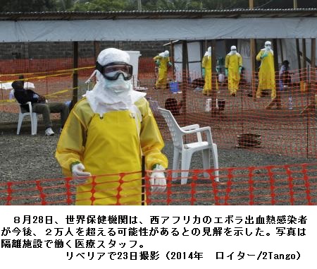 エボラ出血熱感染、2万人超える可能性=WHO ―― [ジュネーブ 28日 ロイター] - 世界保健機関(WHO)は28日、西アフリカのエボラ出血熱感染者が今後、2万人を超える可能性があるとの見解を示した。/WHOは西アフリカの4カ国について感染拡大を阻止するための戦略を発表。その中で、感染者数は報告されている3069人の2─4倍に上る可能性があると指摘した。/WHOは、ギニア、リベリア、シエラレオネ、ナイジェリアに広がったエボラ熱感染に国際社会が協調して大規模な対策を取る必要があるとした。/アフリカ中部コンゴで発生したエボラ出血熱については、西アフリカのウイルスと種類が異なるため、今回発表された見通しには含まれていない。/WHOは、感染が集中している地域での対策が必要で、首都や主要港で感染を止めることに力をいれるべきと強調。依然として多くの地域で感染が拡大しており、前例のないほどの数の医療従事者が死亡していると報告した。 (ロイター 2014年 08月 28日 20:10 JST)