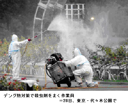 デング熱 新たに2人 代々木公園で感染疑い ―― 東京都と埼玉県は二十八日、海外渡航歴がない都内と県内の男女二人の「デング熱」感染が新たに確認されたと発表した。二人は既に感染が確認されている埼玉県の十代女性と同じ学校の学生。三人とも都立代々木公園(渋谷区)でウイルスを保有する蚊に刺され感染した疑いがある。/発熱などの症状で受診し、二十八日に陽性と分かった。都内の二十代男性は発熱が続き入院中。埼玉県の二十代女性は快方に向かっている。/都などによると、三人は八月上旬から二十二日までに週三回、ほかの学生三十一人と公園でダンスの練習に参加。同じ場所で「蚊に刺された」と話している。他に症状を訴えている学生は出ていない。/都は公園内で蚊を採集調査し、ウイルスを保有する蚊はなかった。二十八日には薬剤を散布して駆除作業を行った。デング熱は患者から血を吸った蚊が媒介して人に感染する。ただ蚊の寿命は三十日程度で、都は「感染が広がる可能性は極めて低い」とみている。 ◇