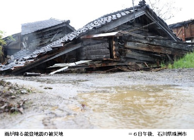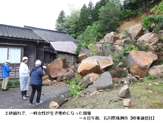 大雨予想、土砂災害に警戒 1人死亡、34人けが―能登地震 ―― 石川県能登地方を震源とした5日の地震で、同県では1人が死亡、33人が負傷し、富山県でも1人が軽傷を負った。石川県では今後、大雨も予想され、余震や土砂災害への警戒が強まっている。