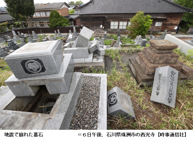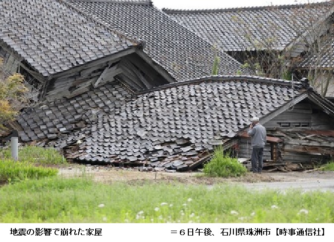 最大震度6強を観測した珠洲市では、はしごから転落した男性(65)が死亡し、2人が重傷、30人が軽傷。6日、市内の740世帯1630人に避難指示が出された。多くの家屋が倒壊したが、他に下敷きになるなどした住民は確認されていない。同県能登町でも1人が軽傷を負った。