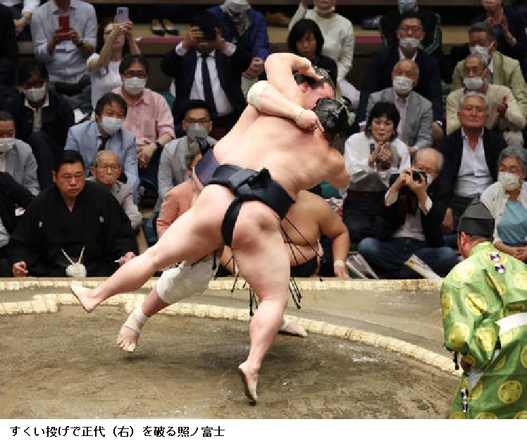 途中休場した昨年秋場所を含め4場所連続休場から復帰の横綱照ノ富士は、小結正代に押し込まれながら、土俵際で逆転のすくい投げを決めた。