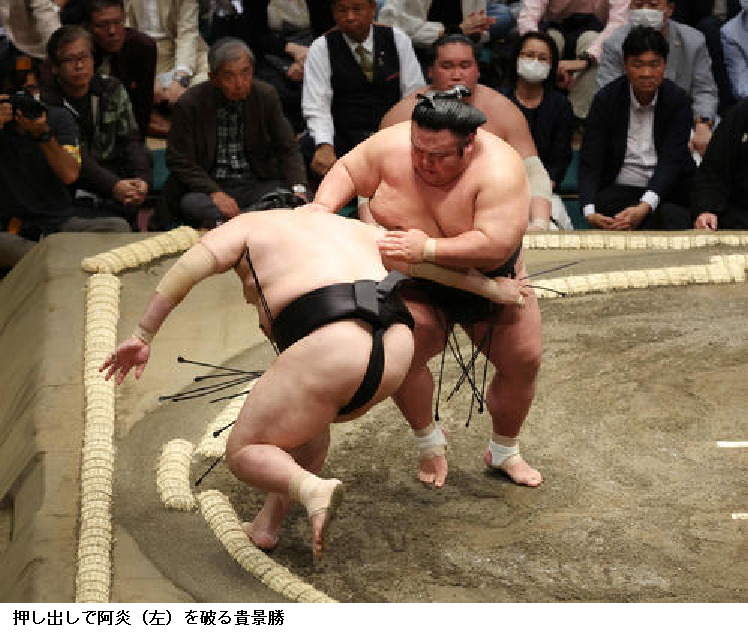 かど番の大関貴景勝は、東前頭筆頭の阿炎を左おっつけから押し出し、初日を白星で飾った。