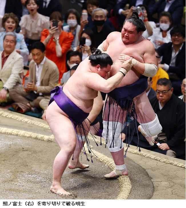 平幕の明生(27=立浪)が、ただ1人全勝だった横綱照ノ富士(31=伊勢ケ浜)に土をつけ、再び優勝争いで照ノ富士、朝乃山(29=高砂)と3人で並びトップに立った。