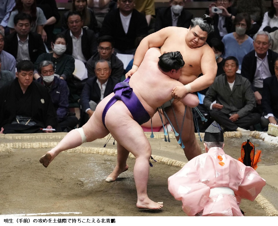 立ち合いからの主導権は明生にあった。押し込まれたが、北青鵬は肩越しに取った右上手だけで安心していた。「(右上手は)狙って取れたんで残せた。(余裕は)全然ありました」。
