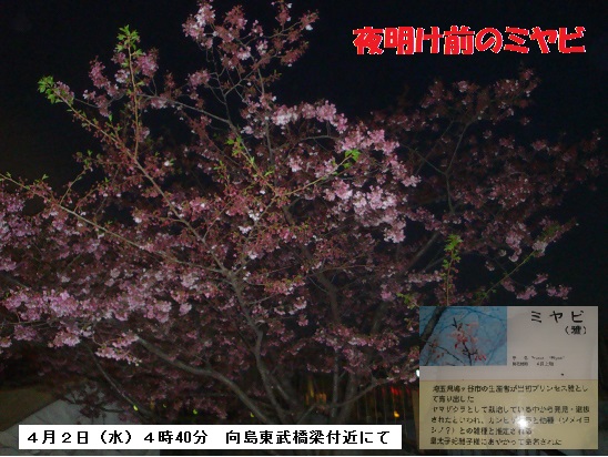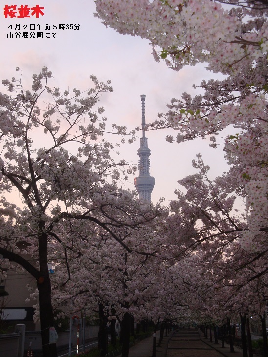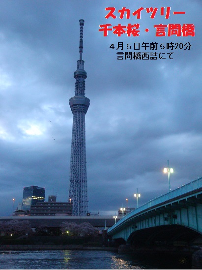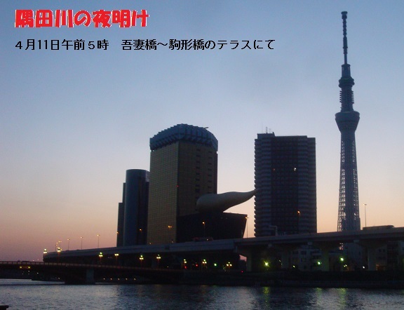 一昨日・昨日と雨が続いき、今朝は風が強く気温も低かったが、洟水をたらしながら桜吹雪の中を徘徊してきました。この分だと2、3日でソメイヨシノも葉桜になってしまうことでしょう。花川戸のテラスを歩きながら、今年も対岸の千本桜も見納めになるのか…… 果たして、来年もこの光景を見ることが出来るやらと、ちょっぴり暗い気持ちになります。