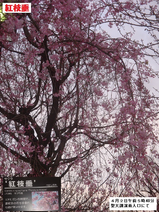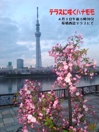 昨日とほぼ同じコースを同じ時刻に徘徊しました。向島遊歩道の東武橋梁付近で、昨日K女史に説明した「皇太子成婚祝い」に作られたという、早咲きの桜「ミヤビ」をデジカメに納めました。昨日は気づきませんでしたが、桜橋西詰テラスにハナモモがピンクの綺麗な花をつけていましたので、これもデジカメに納めます。水上バス乗り場から遊歩道に上がると、山谷堀の桜を見ようと、テニスコートと野球場の間の道を抜けて、石浜通りに出ました。山谷堀公園を横切って、兼愛塾を創設した頃の塾舎があった待乳山聖天(まつちやましょうでん)下の今は駐車場になっている前を通って、聖天公園に入りました。公園を抜けて南の公園入口のところに「紅枝垂」が咲いていましたので、これもカメラに収めました。