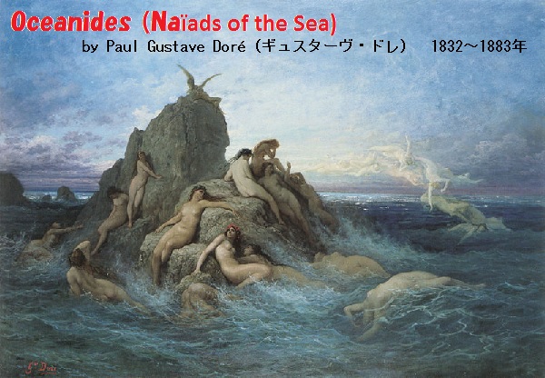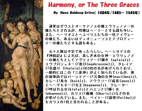 Eurynomē(エウリュノメー)は、Ōkeanos(オーケアノス)とTēthȳs(テーテュース)の娘で、ゼウスとの間に3人の典雅の女神Charites(カリテス)たちを設けました。すなわち、Aglaeā(アグライアー)・Euphrosynē(エウプロシュネー)・Thalia〈タレイアー〉の3柱「Three Graces」です。また一説に河神Āsōpos(アーソーポス)を生んだといいます。