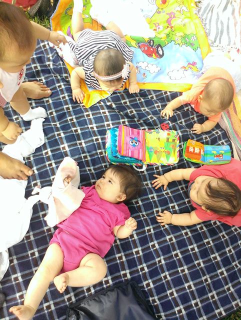 【写真】上向きに寝ているのがはるなです。/マザーズ・グループという地域のお母さんグループの集まりでピクニックをしました。