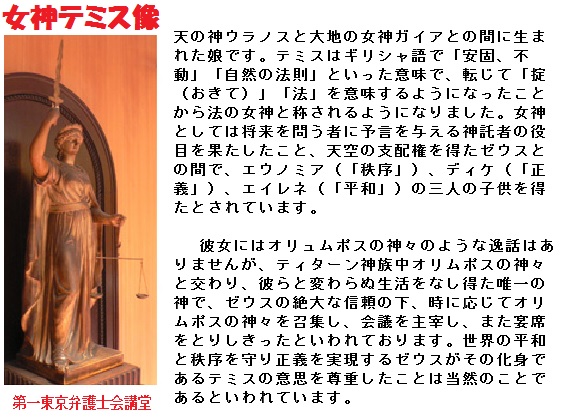 Themis(テミス)は「正義の女神」と見なされることが多いようですが、近代・現代的な意味での「正義」とは異なっています。むしろ、古代ギリシア語で正義に該当する神は、Dikē(ディケー)女神であるといわれます。ギリシア神話においては、Tītān(ティーターン)とÓlympos(オリュンポス)神の戦いの後、敗れたティーターンは主要な神の地位を失い、神話においても多くの神が言及されなくなり、また地位が低下しています。オリュンポスの時代になって、なおその地位と威勢を変わりなく維持した神はテミスだけなのであります。