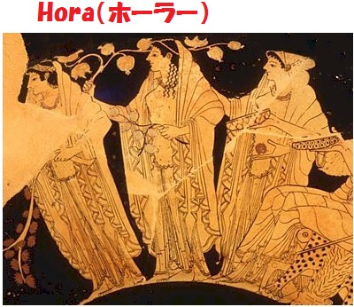 ※Hōrai(ホーライ)の三女神は、「うるわしい女たちで、 万物を生む者であり、定められた順序に従って昼と夜、夏と冬とを招来し、歳月の運行をつつがないものにしている」と言われました。ヘーシオドスによれば彼女らは三人で、エウノミアEunomia〔秩序〕、ディケーDivkh〔正義〕、エイレーネーEijrhvnh〔平和〕でありますが、一般には彼女たちは植物や花を生長させる自然の季節の女神とされ、アッティカでは彼女らはThalloタロー、Auxoアウクソー、Karpoカルポーとされています。しかしやがて彼女らは春夏(秋)冬の季節と同一視されるにいたりました。このようにホーラーたちは自然の正しい移り変わりと人間社会の秩序の二様の女神とみなされているのです。したがって彼女らは優雅な三人の美しい乙女の姿で表され、通常花あるいは植物を手にしています。