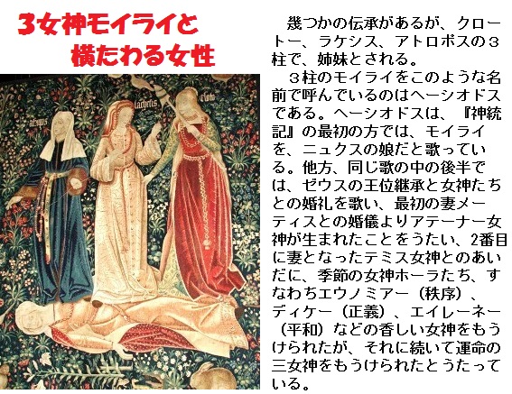Hēsíodos(ヘーシオドス)の『神統記』によると、ゼウスは二番目の妻としてテミスを娶り、二人のあいだには、Hōrai(ホーライ)の三女神が生まれました。更に、Klōthō(クロートー、長姉/紡ぐ者)、Lachesis(ラケシス、次女/測る者)、Atropos(アトロポス、末妹/切る者)のMoirai(モイライ)の三女神も生まれました。この結婚の成り行きについてはいささか不明な点が多いのであります。