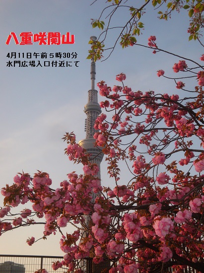 今朝も、桜橋~駒形橋の隅田川を一巡しました。昨日は夏日に近い暖かさだったのに、今朝は風も強く冬が舞い戻ったようです。ソメイヨシノは既に散ってしまったようですが、八重咲きの「関山」という桜が、ソメイヨシノよりも濃いピンクの花をつけています。