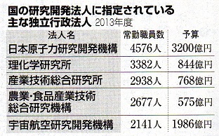 政府、理研の特定法人指定先送り ―― 理化学研究所の調査委員会がSTAP細胞の論文の不正を認定したことは、医療分野を成長戦略の柱の一つとしてきた政府も深刻な事態と受け止めている。下村博文文部科学相は1日、政府が世界最高レベルの研究を目指して新設する「特定国立研究開発法人」に理研を指定する法案について「今月中の閣議決定は難しい」と先送りする意向を表明。政府は他の研究機関に対する不信感が広がらないよう火消しに追われたが、危機感は広がるばかりだ。/菅義偉(よしひで)官房長官は1日の記者会見で、不正認定に関し「誠に遺憾だ」と述べた。新法人に理研を指定するかどうかについては「理研のガバナンス(統治)をしっかり見極めた上で適切に対応したい」と慎重姿勢を示した。山本一太科学技術政策担当相も同日、記者団に「理研のこれからの対応を見極めないと前に進めない」と語った。/政府が特に懸念するのは今回の不正で成長戦略の担い手として期待する世界トップレベルの研究者が日本に集まらなくなることだ。政府高官が「今回は理研だけの問題だ」と他の研究機関への影響拡大を否定したのも危機感の表れだった。 (産経ニュース 2014.4.2 08:46 )
