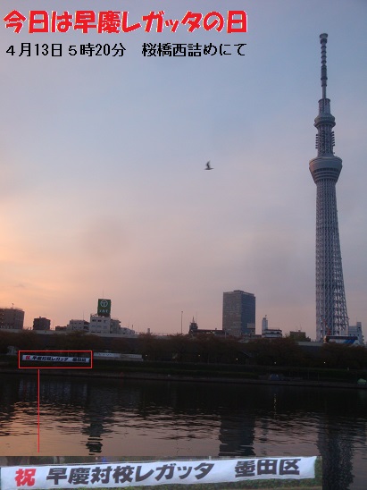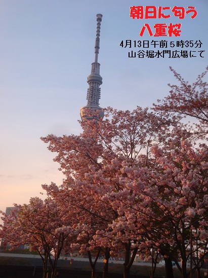昨日曜日は、何時もどおり、桜橋~駒形橋の隅田川を一巡。ソメイヨシノはすっかり葉桜になってしまったようですが、公園の所々に植えてある里桜か満開となりました。今日は此処隅田川で早慶対抗のレガッタが開催されるといいます。