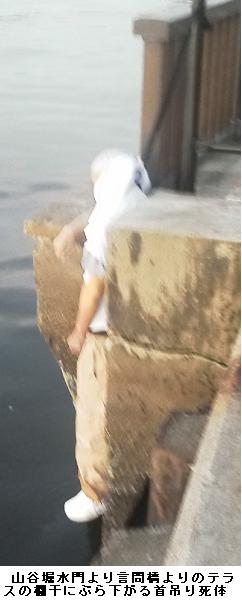 今朝も同じコースで言問橋の下を潜り、午前5時15分頃山谷堀水門にかかる所で、大きく手を振りながら爺を呼んでいる人がいる。足を速めて近づくと、「携帯をお持ちですか」と言うことで、「どうされました?」と訊ねるると、テラスの欄干の下を指差しながら、「首吊り自殺ですよ。110番に電話して下さい」ということであった。