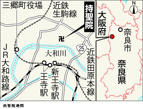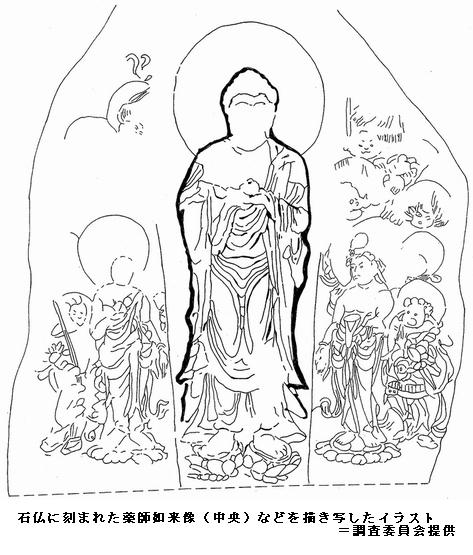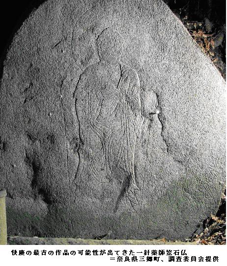 裏山に快慶の石仏、最古作品の可能性 奈良県三郷町 ―― 奈良県三郷(さんごう)町の持聖院(じしょういん)にある薬師如来像の石仏が、鎌倉時代を代表する仏師・快慶(かいけい)の作品であることがわかった。最古の作品の可能性もあるという。町教委などでつくる調査委員会が11月、岡山市の就実大学であるシンポジウムで発表する。/院は、鎌倉時代の高僧・貞慶(じょうけい=解脱上人〈げだつしょうにん〉、1155~1213年)が開いたとされる惣持寺(そうじじ=廃寺)の子院。院の裏山にあった「一針薬師(ひとはりやくし)笠石仏」(町文化財、高さ2.2メートル、幅2メートル、厚さ25~30センチ)は、花崗岩(かこうがん)の表面に細い線で薬師如来像や日光・月光菩薩(ぼさつ)像などを刻んでいるが風化で薄れ、信者がなでたためか顔の表情は不鮮明になっている。/倒壊の危険があったため、調査委が5月、解体調査。笠のように上に載った石の裏側に銘文が刻まれており、「解脱上人」の「本願」で「アン大工匠人」(アンは梵字〈ぼんじ〉)が造立したと記されていた。/調査委は、貞慶と親しかった僧侶の伝記「三輪上人行状」(1255年)に貞慶の発願で快慶に依頼して薬師像を作ったとの記述があり、一致する。