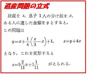 遺産相続の問題では、例えば、「ある人が死ぬ前、4人の息子に財産を等しく分配し、ある1人の人に息子1人の分け前と、その分け前を全財産の3分の1からから引いた残りの4分の1と1ジルヘム(お金の単位)を加えたものを与えると遺言した」というのがある。