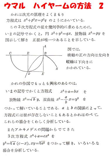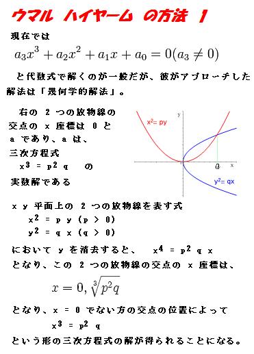 Omar(ウマル)が試みた解法のアプローチは、彼以前にすでに、古代ギリシアの数学者であり、アレクサンドロス大王の教師で「数学に王道はない」と述べたとも伝わっているMenaechmus〔メナイクモス、BC380~320年〕などによって試みられていたというが、Omar Khayyám(ウマル・ハイヤーム)はこの方法を発展させて一般化し、三次方程式一般の解法を提示した(左図参照)。更にハイヤームは、二項展開を発見し、Eukleides(エウクレイデス)の平行線の理論に対する批判書を著し、これは欧州に伝わり、結果的に非ユークリッド幾何学の発展に寄与した。