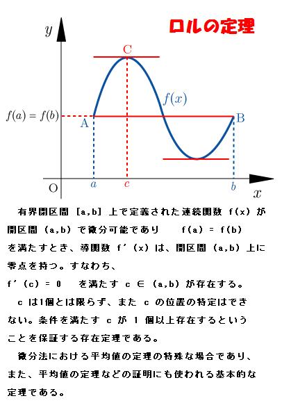 ※ ロルの定理(Rolle's theorem、左図参照) は1691年にフランスの数学者Michel Rolle (ミシェル・ロル、1652~1719年)が著書の「代数学」(Traite d'algebre) で発表されたためにロルの名がついているが、Isaac Newton〔アイザック ニュートン、1642~1727年〕やGottfried Leibniz〔ゴットフリート ライプニッツ、 1646~1716年〕によって微分が発見されるより前の12世紀にインドの天文学者バスカラが同様の定理を述べたとされる。