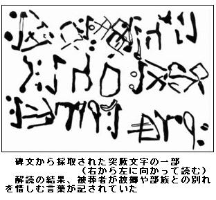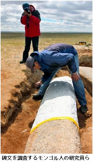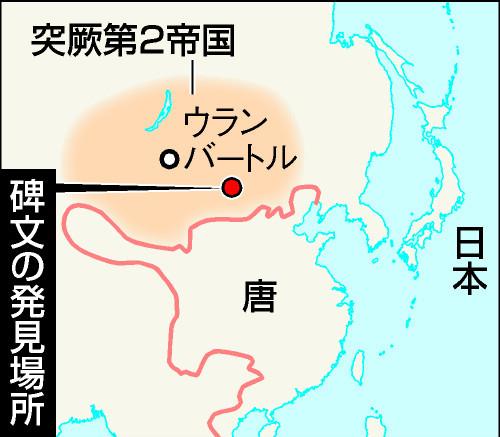 モンゴルで遊牧民の巨大碑文発見 「我が土地よ、ああ」 ―― 8世紀中ごろのトルコ系遊牧民族「突厥(とっけつ)」の巨大な碑文をモンゴル東部の草原で発見した、と大阪大大学院の大澤孝教授(古代トルコ史)が16日発表した。中国の隋・唐の各帝国と時に対立し、時に結びながら中央アジアを支配した突厥の国家体制や制度を解明する貴重な史料となりそうだ。/大澤教授とモンゴル科学アカデミー考古学研究所は5月、ウランバートルの南東約400キロにあるデレゲルハーン山近郊のドンゴイン・シレーと呼ばれる遺跡で、それぞれ全長約4メートルと約3メートルの碑文の残片を発見した。計20行、2832文字の古代トルコ文字(突厥文字)が刻まれ、解読の結果、「我が家よ、ああ」「我が土地よ、ああ」など、死者が家族や故郷との別れを惜しむ文面だった。刻まれた部族の紋章から、突厥第2帝国(682~744年)の王家、アシナ氏の一員の墓碑とみられる。/突厥は、中央ユーラシアの遊牧民族で最も古くに独自の言語と文字を残した。著名な3大碑文(ビルゲ可汗〈カガン〉、キョルテギン、トニュクク〕が19世紀末にモンゴル中部で見つかっているが、それらに匹敵する碑文の発見は約120年ぶり。大澤教授は「地中に埋まっている部分に被葬者の生前の事績が記されている可能性がある」と話す。