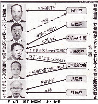 都知事選では、前神奈川県知事の松沢成文氏(54)、前日弁連会長の宇都宮健児氏(65)に続き、十三日に元自民党総務会長の笹川尭(たかし)氏(77)が立候補表明した。また、民主党都連などが新党改革代表の参院議員舛添要一氏(63)に非公式に出馬を打診している。 〔東京新聞 2012年11月14日 朝刊〕