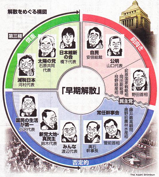 ◇既成政党は批判:日本維新の会と太陽の党の合流が決まった17日、既成政党側からは第三極をけん制する発言が相次いだ。/野田佳彦首相は東京都内で記者団に「小異を捨てて大同につくという言葉を安易に使うが、税金、TPP含めての経済、外交・安保をどうするのかなど大事なものも捨ててくっつくというのは野合になる」と批判。自民党の石破茂幹事長は広島市の講演で「橋下(徹)さんと石原(慎太郎)さんという人気者がいることは分かるが、なんで一緒になるのかよく分からない」と疑問を呈した。公明党の山口那津男代表も東京・池袋駅前の街頭演説で「人気ばかりで責任感も乏しい。淡い期待に日本を委ねる時間的余裕はない」と語った。