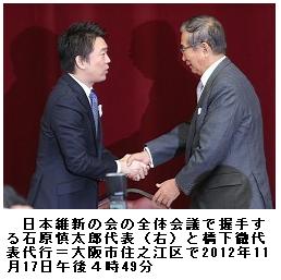 クローズアップ2012:維新、太陽と合流 「大同団結」政策骨抜き 石原氏の「顔」頼み ―― 日本維新の会が太陽の党と合流、1次公認候補も発表して衆院選に向けた態勢を整えた。しかし、太陽とは原発など主要政策で隔たりが大きく、石原慎太郎新代表の知名度が目当ての野合という批判は避けられない。一方で全国での候補者擁立は遅れている。連携するみんなの党とは都市部中心の支持層が重なるため、選挙区調整は難航も予想される。前途多難な船出になりそうだ。/「民主党にも自民党にも政党を7回も変えた人がいる。人のことを野合と言えるのか」。石原氏は野田佳彦首相が第三極を「野合」と批判したことに色をなして反論した。橋下徹代表代行も「民主党や自民党は消費税や環太平洋パートナーシップ協定(TPP)、エネルギーは僕ら以上にまとまっていない。僕らははるかに一致している」と強調した。2人は、もともと脱原発などで隔たりがあり、他党の批判に神経をとがらせている。/しかし、主要政策での差異は容易には埋めがたい。17日に石原、橋下両氏が合意した基本政策は合流を優先し、国民の関心が高い政策で骨抜きやあいまいさが目立つ。/ 橋下氏は大阪市長として「2030年までの原発ゼロ」を表明、みんなの党との政策合意にも脱原発が盛り込まれた。ところが、基本政策には安全基準など「ルールの構築」とあるのみだ。/橋下氏は「年代を明記していないが、新エネルギー体制のルール作りをすることになった」と引き続き脱原発を掲げる考えを強調したが、石原氏は「何年か前、電気料金が上がった時は日本のアルミ産業が全滅した」と語るなど、ちぐはぐさは隠しようもない。脱原発は民主党が争点化をもくろんでおり、今後の選挙戦で維新のアキレスけんとなる可能性も出てきた。/維新八策に盛り込んだ企業・団体献金の廃止も、経過措置として一定額以下は認めるなど「玉虫色」の決着となった。/一方で、道州制や消費税の地方税化など、橋下氏の持論の「統治機構改革」に関わるテーマは維持された。太陽幹部が「将来の大まかな方向性として示すのは構わない」と語るなど、「大同団結」のため黙認した形だ。/両者が食い違いを棚上げにしてまで合流を急いだのはやはり衆院選対策だ。/維新が17日に発表した第1次公認候補は47人にとどまる。選挙準備の遅れは地盤の近畿以外で特に目立つ。東京を中心に高い知名度を持ち、都知事選で圧勝した石原氏は魅力だ。橋下氏は「全国遊説は石原氏と回りたい」と強調した。代表ポストを石原氏としたのも、大阪中心の支持を全国に広げるきっかけとしたいという狙いがある。/一方、手勢を欠く石原氏にとってもアピール力の高い橋下氏との連携は欠かせない。橋下氏への距離感が違う太陽の平沼赳夫氏らの了解できる範囲で、「中央集権打破」のイメージを優先した。/石原氏は全体会議のあいさつで「小さなことはこれから議論すればいい。国を変えるため大きな眼目二つか三つ掲げて力を合わせよう」と語り、政策の棚上げを正当化した。