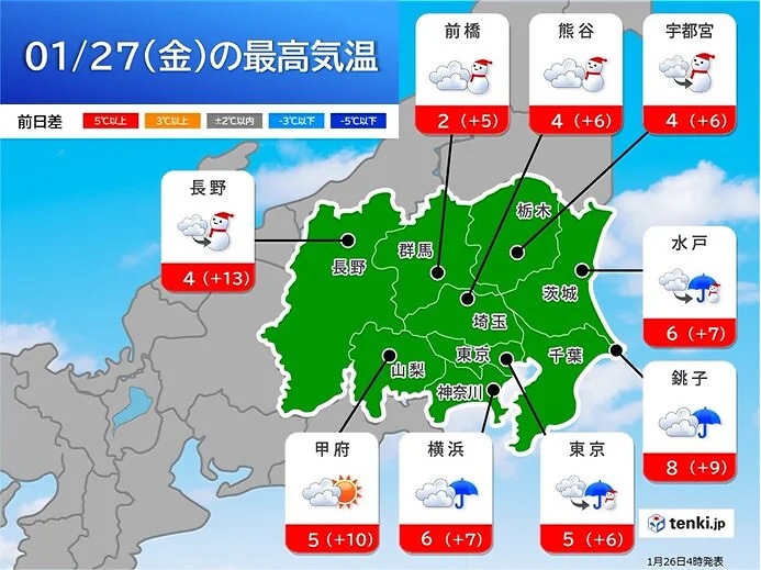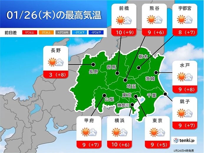 日中の最高気温は、きのう25日よりも5℃から8℃ほど高く、凍えるような寒さは解消されるでしょう。ただ、それでも東京都心は9℃と、10℃に届かない所が多く、空気は冷たいでしょう。暖かくしてお過ごしください。