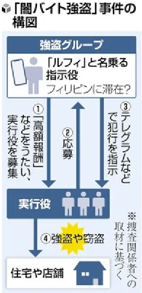 ルフィは人気漫画の主人公の名前をまねている可能性がある。SNSの「闇バイト」で募った実行役のメンバーに対し、メッセージを自動的に消去できる通信アプリ「テレグラム」を通じ、犯行の日時や場所、手口などを具体的に指示していたという。