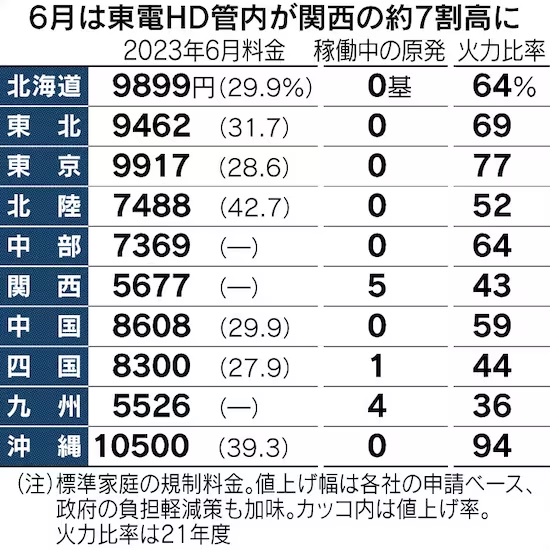 電気代高騰を受けて政府が2月に始める負担軽減策では、1キロワット時あたり7円が割り引かれる。電力会社によってベースの料金に差はあるが、補助額は全国一律だ。割引分を組み入れると、6月の東電の料金は9917円、関電は5677円となる。1月に約2割だった東電と関電の料金差は、7割超にまで広がる計算だ。